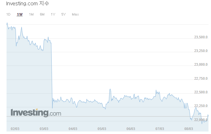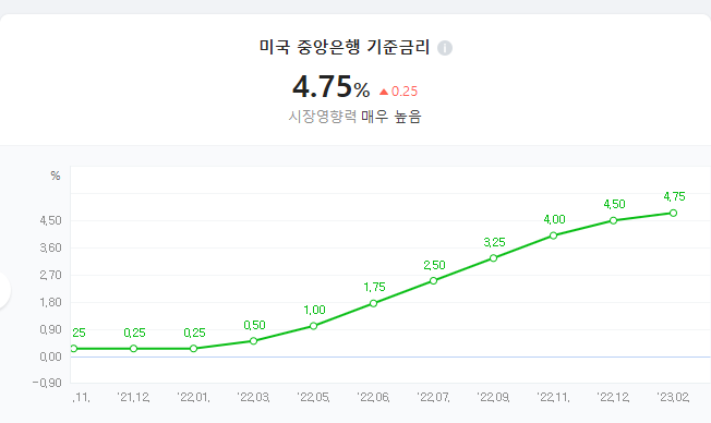 8일자 우리나라 코스피 입니다. 약 1.3%가량 하락하는 모습을 보여주고 있습니다. 파월은 통화 긴축 속도가 더디다는 판단 하에 기준금리를 더욱 끌어올려 인플레이션을 잡겠다는 의지를 보여주었고, 일부 전문가들은 연내 6%까지 상승 할 수 있다는 전망마저 나오고 있습니다. 현재 미국 중앙은행 기준 금리는 4.75%입니다. 이마저도 지난 1년간 2배 넘는 수치로 가파르게 상승해 왔음을 볼 수 있습니다.