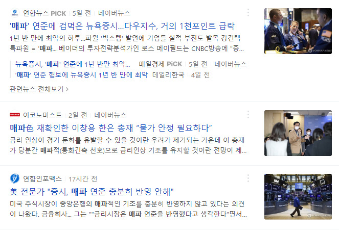 그렇다면 경제학에서 쓰이는 매파라는 단어는 어떤의미일까? 경제학에서 매파는 통화 정책상 강경파를 말한다. 지금의 미 연준 처럼 과열된 경기를 안정시키기 위해 기준금리를 인상하여 인플레이션을 억제하고자 하는 모습을 말한다. 즉 통화 긴축을 선호하는 모습이다. 이렇게 금리가 인상되는 시기에는 금리에 영향을 받은 기술주나 성장주 등의 주가가 하락세를 보일 수 있다. 또 미국 금리가 올라간다면? 미국의 국채 금리가 올라가고 달러 강세 현상을 보일 것이다. 즉 원달러 환율이 높아지면서 달러가 비싸질 것이다. 코로나 때문이 아니어도 비싸진 달러로 인해 당분간 미국 여행은 어려울 듯 하다.