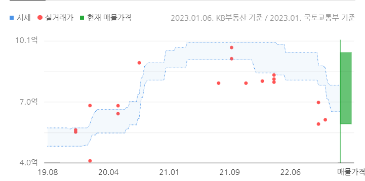 또 다른 세종시 아파트의 매매 가격 추이 입니다.  앞서 말씀 드린것 처럼  21년 이후 급등하는 모습을 보이다가 22년 하반기 이후로 하락하는 모습을 보여주고 있습니다.