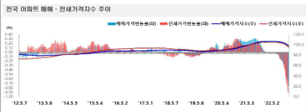 한국 부동산원의 전국 아파트 매매, 전세가격지수 추이 입니다. 22년 5월을 기점으로 전국적으로 큰폭으로 하락하는 모습을 볼 수 있습니다. 이제 12월자료까지 전부 나온 현재 집값 하락 지역을 살펴보면, 세종시 의왕시 광명시등이 차지 하고 있습니다. 이에 대해 살펴보도록 하겠습니다.