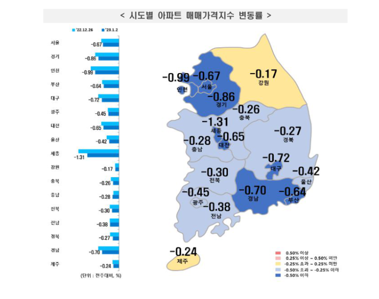 ↓ 한국 부동산원의 전주 대비 금주의 매매가격 지수 변동률입니다. 이 자료에서도 세종시의 하락률이 눈이 띄는것을 알 수 있습니다.