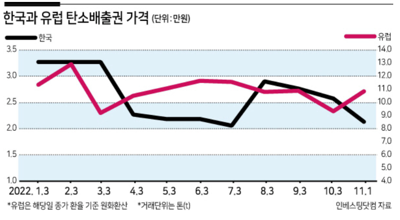 앞서 말씀 드린것처럼 우리나라의 탄소배출권 시장은 유럽등에 비해 미미한 수준입니다. 같은 기간 유럽탄소배출권 선물과 한국의 대표적 배출권 상품인 KAU22의 거래대금을 비교해보면 약 4~5배 가량 차이가 납니다. 하지만 정부가 증권사의 참여 범위를 확대하고 있고, 활성화에 노력하고 있는 만큼 시장이 활성화될 가능성도 있습니다.