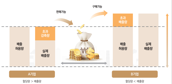 - 할당량배출권 : 의무 감축 주제별로 배출 할 수 있는 온실가스 배출 권리로 정부가 기업에 배출권을 할당하고 나면 기업은 초과하거나 남는 배출량을 배출권 형태로 시장에서 거래할 수 있음