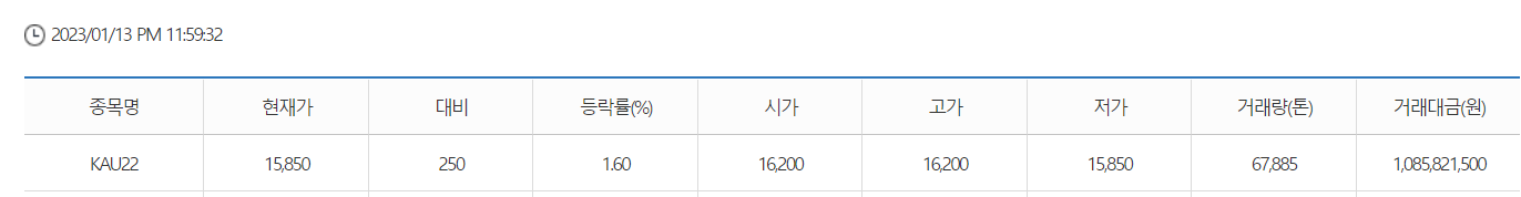 한국거래소의 자료에 따르면 탄소배출권의 장내 거래량은 점점 증가하는 추세였으나, 최근 탄소배출권 거래 가격 하락으로 거래 대금이 줄어들기도 했습니다. 1.13일 기준 현재 가격은 15,850원이네요.